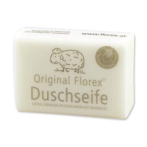 Unsere Duschseife verströmt zarten angenehmen Duft und pflegt die Haut mit Mandelöl, Lanolin und biologischer Schafmilch. Für ein extra schaumiges Duschvergnügen. Genießen Sie den himmlischen Duft der Schneerose beim Duschen! Original Florex Duschseife mit Schafmilch ist durch ihre hochwertigen Inhaltsstoffe besonders hautverträglich und eignet sich daher auch hervorragend für empfindliche Haut. Mit biologischer Schafmilch - Hergestellt in Österreich