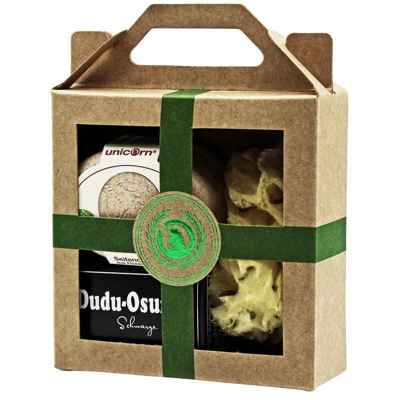 Produktinformationen "Geschenk-Set mini-Seifendose klein sahneweiß, Dudu Osun® CLASSIC 25g, Naturschwamm klein"