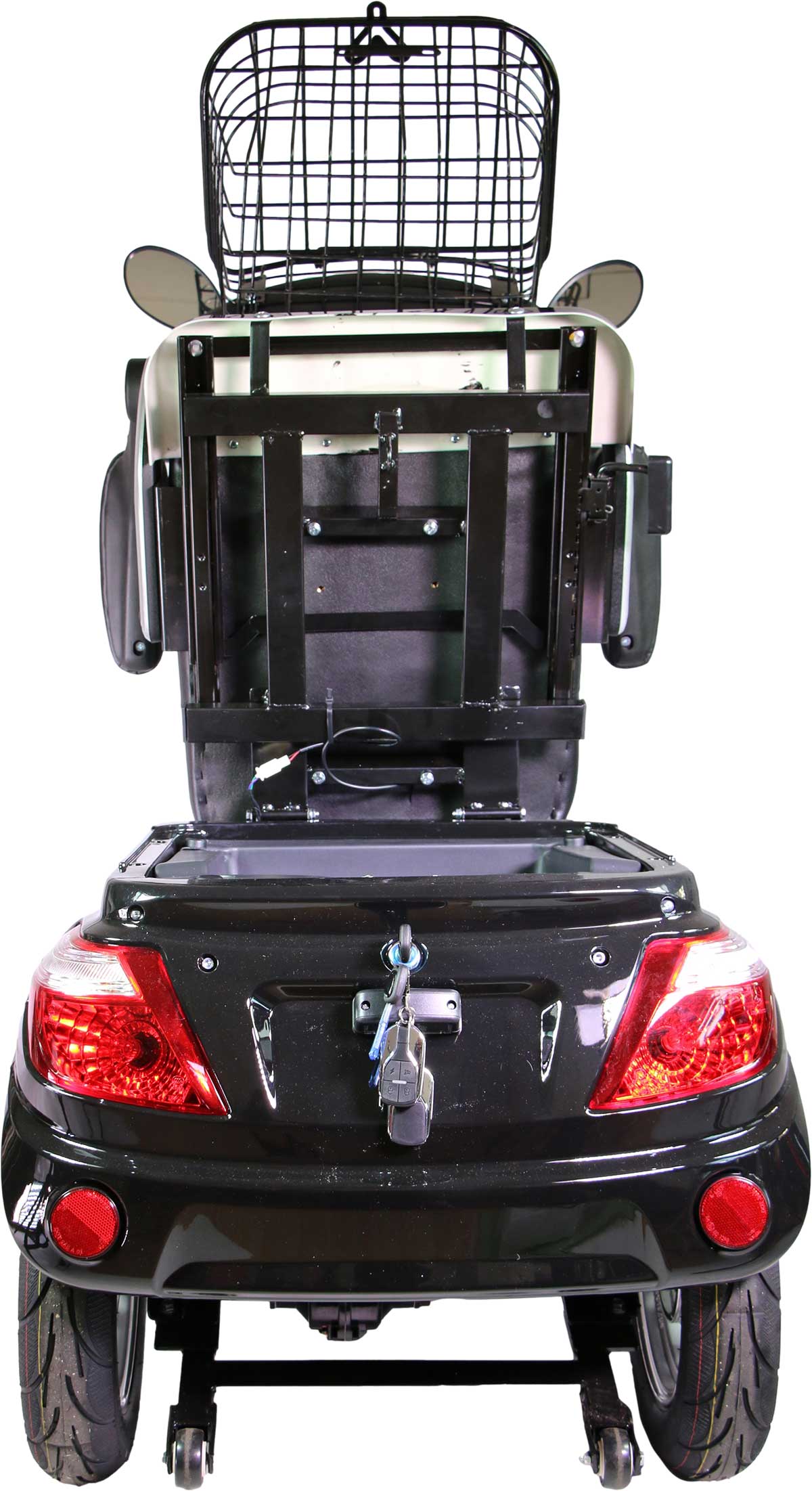 7. Stauraum und Einkaufskorb: Das Elektromobil verfügt über einen großzügigen Stauraum unter der Sitzbank sowie einen praktischen Einkaufskorb an der Rückseite. Dadurch können Nutzer ihre persönlichen Gegenstände sicher verstauen und sogar Einkäufe bequem transportieren.