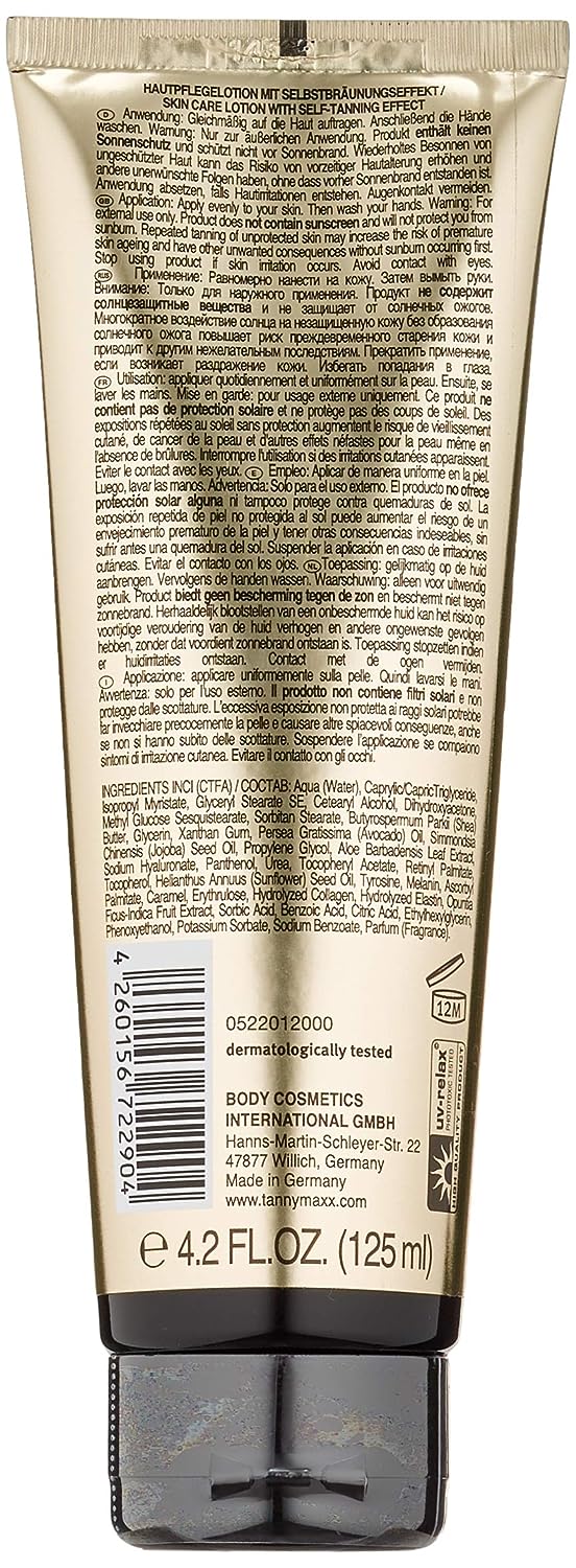 Eine schöne Bräune ist heute ein Symbol für Gesundheit und Lebenskraft. Tannymaxx Gold unterstützt sowohl den natürlichen Bräunungsprozess der Haut unter UV-Einstrahlung als auch die hauteigene Regenerationsfähigkeit. Ziel ist neben natürlich schöner Bräune der Erhalt der Schutzfunktion Ihrer Haut. Milde und hochreine Inhaltsstoffe wie Urea vermeiden dabei Haut- Irritationen und versorgen Ihre Haut mit Feuchtigkeit. Zieht schnell ein, fettet nicht und hat eine dezente Pfirsich-Note.